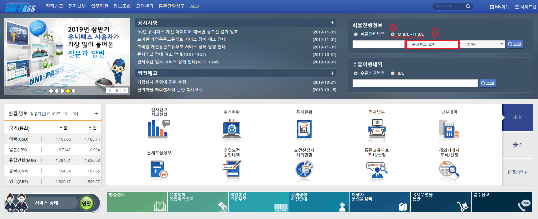 M B/L - H B/L에 체크를 하고 두번째 칸에 2번에서 확인한 운송장번호를 입력합니다.
