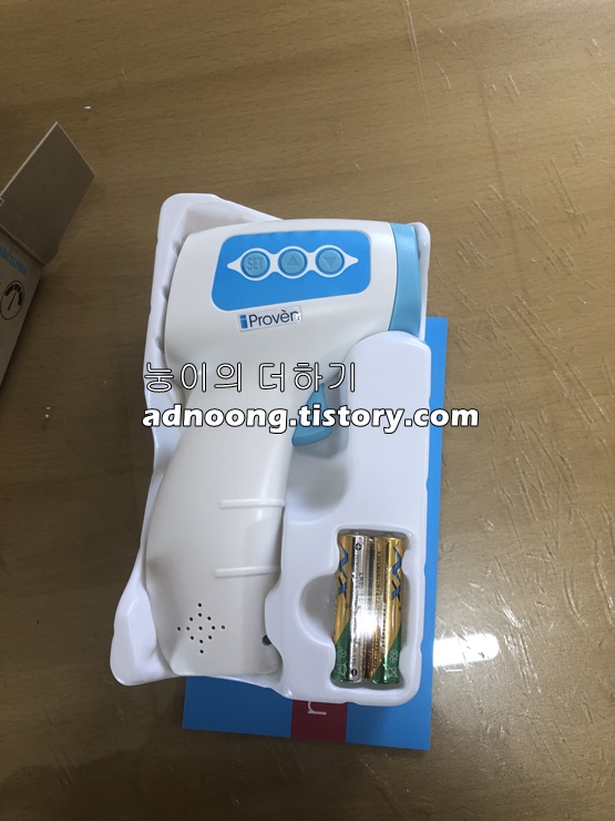 박스를 열어보면 위와 같은 모양을 하고 있습니다. 내용물은 설명서, 본체, 배터리로 구성되어있는데... 본체는 꼭 애들 장난감 같은 플라스틱 느낌으로 고급스러움은 느껴지지 않습니다. 그래도 상황이 상황인지라 제대로 체온만 측정 가능하면 됩니다.