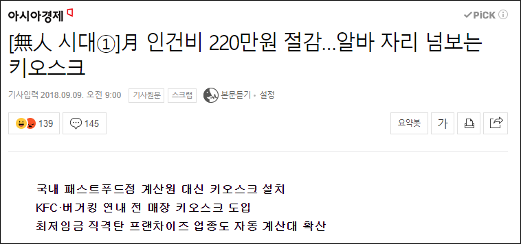 과거 조사된 자료들을 보면 사용자들은 키오스크 이용에 불편함을 느끼는 경우가 많았습니다. 하지만 아래 기사에서 보는 것과 같이 인건비 절감효과가 높아 사업자들이 키오스크를 도입하는 사례가 늘고 있습니다.