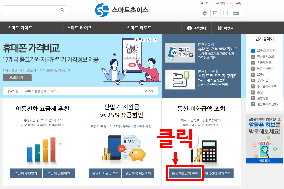 개개인이 일일이 통신사별로 조회를 하면 너무 힘들겠죠? 그래서 정부는 (사)한국통신사업자연합회를 통해 주요 통신사들의 통신미환급액을 한번에 조회할 수 있도록 스마트초이스라는 사이트를 운영하고 있으며 국민 개개인은 이 사이트를 통해 일괄 조회가 가능합니다.