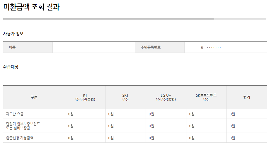 이게 아쉬운건지는 모르지만 저는 아쉽게도 남아있는 금액이 없네요. 통신비 미환급액이 없네요..^^