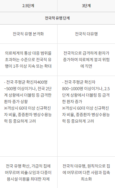 코로나 확산세가 꺾이지 않아 국민들이 지쳐가고 사회적거리두기 2단계는 몇주째 이어지고 있습니다. 2단계를 유지하는데도 계속 확산이 된다면 아래 표와 같이 사회적거리두기 2.5단계, 3단계로 격상이 될 우려가 있습니다. 지금 만큼의 생활조차 못할수도 있는 것입니다.