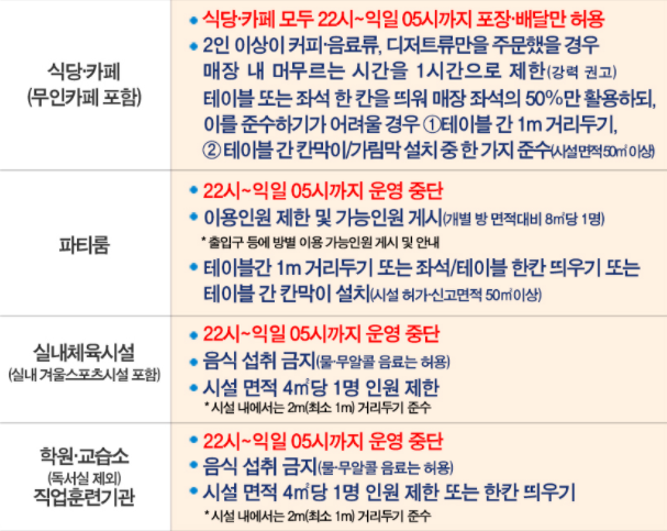 식당이나 카페의 경우 22시~익일 05시까지 영업은 가능하지만 포장과 배달만 허용됩니다. 식당이나 카페에서 2인 이상이 커피, 음료, 디저트류만 주문했을 경우에는 카페에 1시간 이상 머무를 수 없습니다. 이는 정부에서도 강력하게 권고하고 있는 사항이오니 꼭 지켜야 할 것입니다.