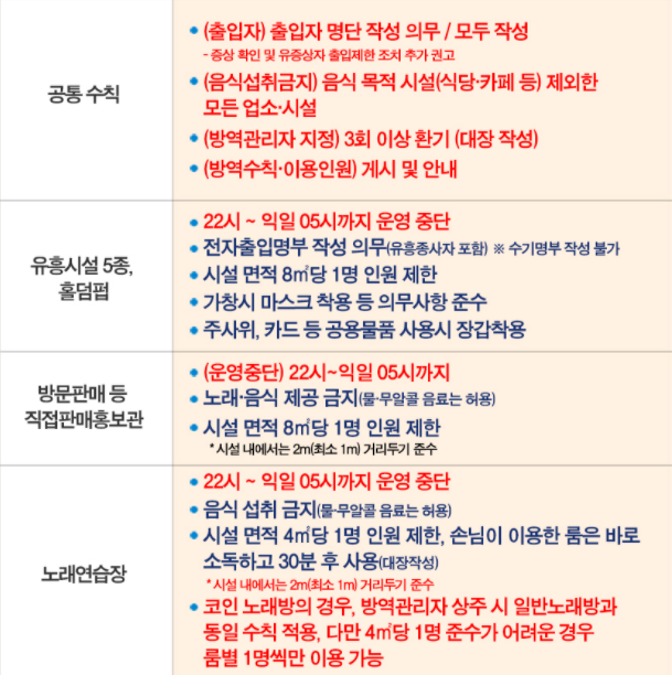 기타 목욕탕, 영화관 및 공연장, PC방, 독서실, 마트 등은 상기 표를 참고해주시기 바랍니다. PC방이나 독서실과 같이 붙어 앉게 좌석이 된 업종의 경우는 띄어앉기를 하게 되어있으며 음식섭취는 기본적으로 제한되고 물과 무알콜 음료만 허용됩니다.