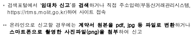 온라인 신고는 검색창에 '임대차 신고'를 검색하거나 직접 주소입력(https://rtms.molit.go.kr)로 접속하여 계약서 원본을 pdf 또는 jpg로 스캔하여 첨부하는 방법으로 신고를 하면 됩니다.