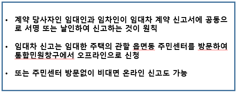 임대차 신고는 임대한 주택의 관할 읍면동 주민센터를 방문하여 통합민원창구에서 오프라인으로 신청을 해도 되며 구축된 전용시스템을 바탕으로 주민센터에 방문하지 않고 온라인으로 신고를 해도 됩니다.