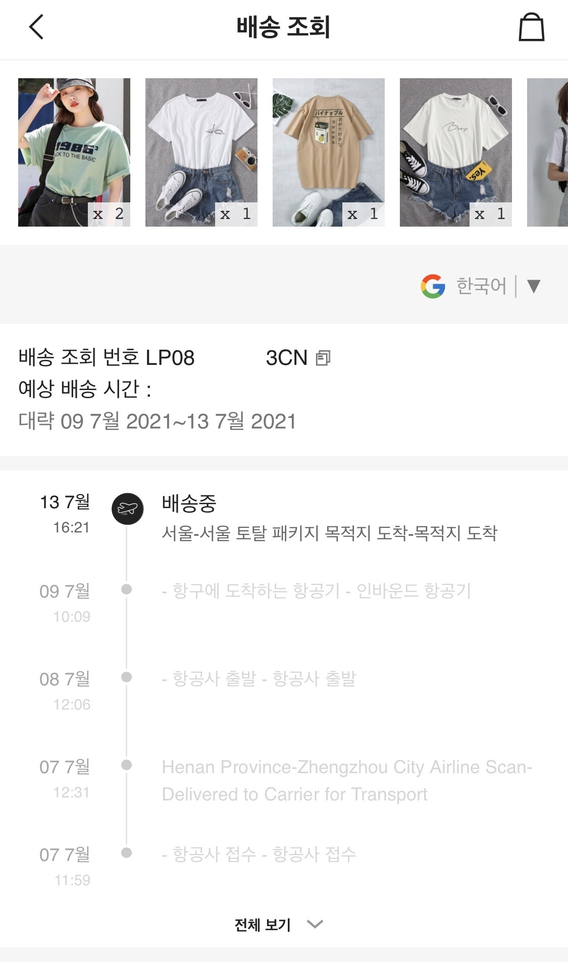 위와 같이 송장번호 입력 후 배송 추척을 누르시면 현재 쉬인의 배송 상황이 쭉~ 나옵니다.