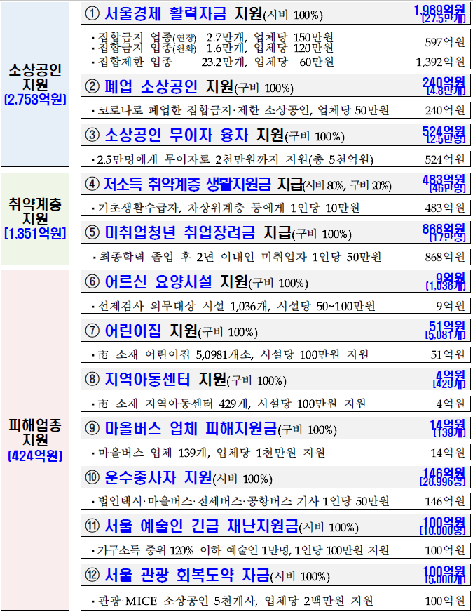 아울러 요양시설, 어린이집, 지역아동센터 및 코로나로 인해 이용자가 줄어들어 피해를 입은 마일버스 업체나 운수종사자(법인택시, 마을버스, 전세버스 등), 서울 예술인 등도 지원 대상에 포함이 되었습니다.