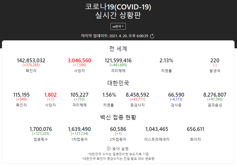 백신 수급만 원활하게 이루어지면 세계 최고의 의료시스템을 갖춘 대한민국이라 접종률은 순식간에 올라가고, 코로나에서 어느 나라보다 빨리 벗어날수 있을 것으로 기대합니다. 이제 본격적으로 계약을 했던 화이자 및 모더나 백신이 들어오기 시작했으니 정부의 목표대로 9월 내 집단면역이 형성되어 일상으로 복귀하기만을 희망해봅니다.