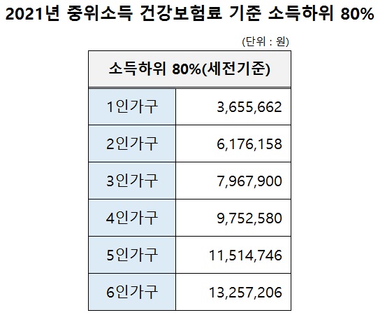 위 표에서 보시는 것과 같이 중위소득 건강보험료 기준으로 한 소득하위 80% 금액은 1인 가구 365만5662원, 2인가구 617만6158원, 3인가구 796만7900원, 4인가구 975만2580원, 5인가구 1151만4746원, 6인가구 1325만7206원입니다.