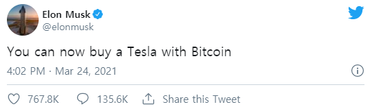 어제 저녁 비트코인 관련 큰 이슈가 있었습니다. 바로 테슬라의 CEO인 엘론 머스크가 트위터에 "비트코인으로 테슬라를 구매할수 있다"고 글을 남긴겁니다.