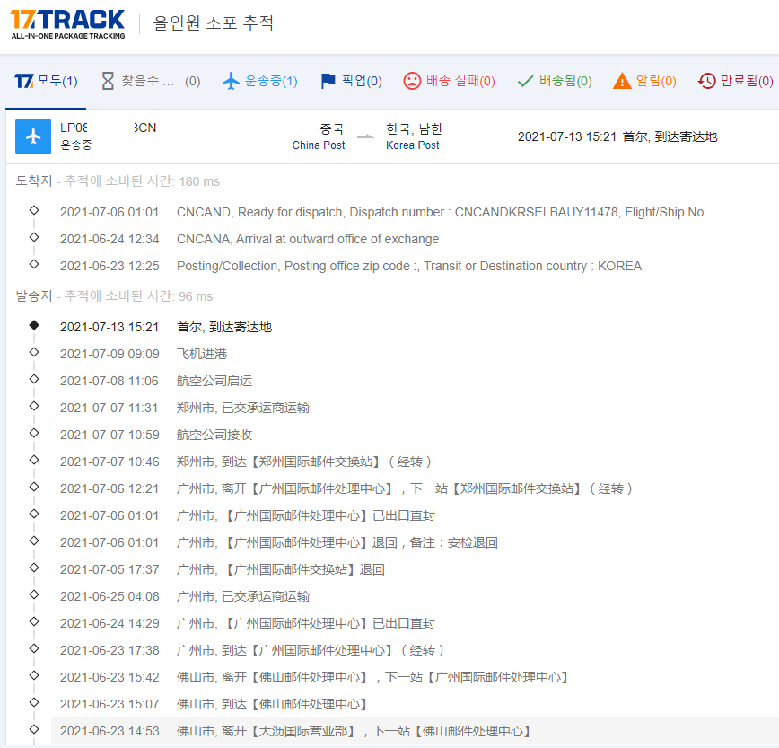 크롬을 통해 번역해보니 세인에서 조회한 것과 차이가 없습니다. 세인이 17TRACK을 이용해서 정보를 제공하는게 아닌가 싶을 정도로 시차만 약간씩 있을 뿐 완전 동일한 정보를 제공하네요..ㅠㅠ